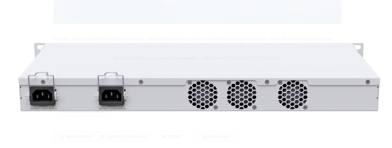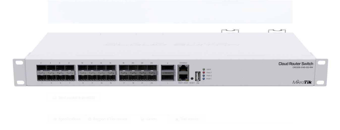 If you work with a substantial amount of data, such as providing Internet access or maintaining a huge data center, this is the perfect upgrade. CRS326-24S+2Q+RM is the first product with 40 Gbps QSFP+ ports for an extremely fast and stable fiber connection. It has 2 QSFP+ ports of 40 Gbps and 24 SFP+ ports of 10 Gbps, which ensure a switching capacity of 640 Gbps and a forwarding rate of 252 Mbps. CRS326-24S+2Q+RM is easy to administer, has a USB port for configuration and a dual power supply for redundancy. You can choose the RouterOS operating system, if you want router-type functions and other level 3 features, or a simpler SwOS.