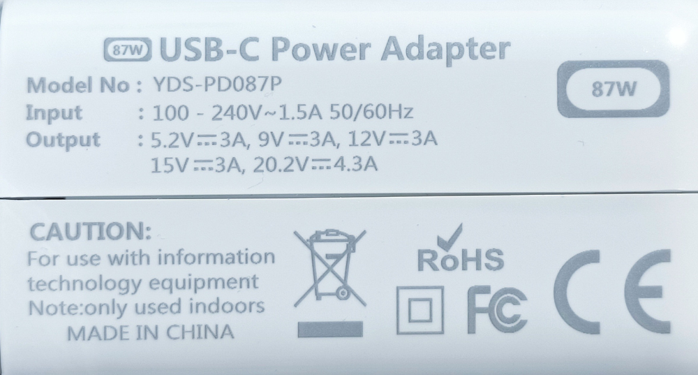 - Output voltage : 20.2V/4.3A, 15V/3A, 12V/3A, 9V/3A, 5.2A/3A