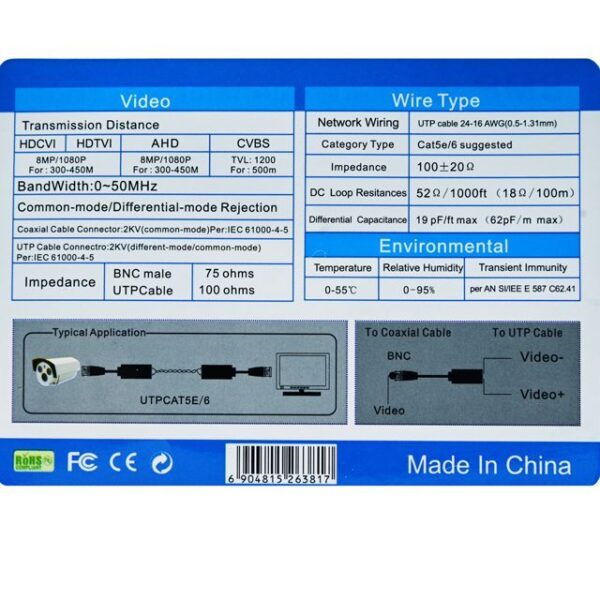 - HD video balun for HD video signal transmission, 720P/1080P via UTP cable cat5e/6e